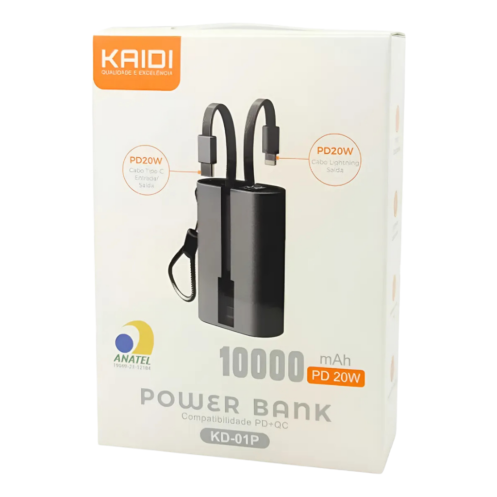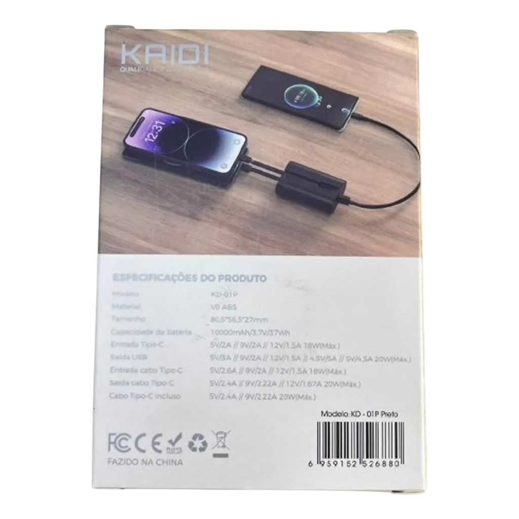O Power Bank Kaidi 10000mAh - KD-09P é a solução ideal para quem busca praticidade, potência e segurança no dia a dia. Com alta capacidade de 10000mAh, permite múltiplas recargas para smartphones, tablets e outros dispositivos compatíveis, oferecendo mais autonomia em viagens, no trabalho ou em situações de emergência. Seu design moderno, compacto e resistente facilita o transporte e garante durabilidade. O modelo conta com tecnologia de carregamento rápido e múltiplas saídas, permitindo carregar mais de um dispositivo ao mesmo tempo. Além disso, possui sistema de proteção inteligente contra sobrecarga, superaquecimento e curto-circuito, garantindo um uso seguro e confiável.